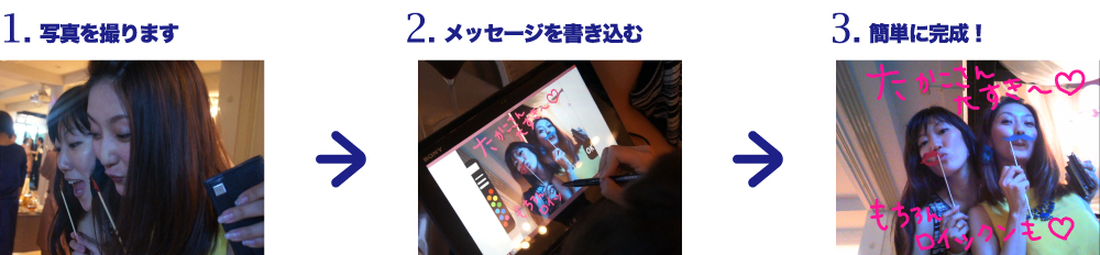 2回連続での撮影で、2コマアニメーションとなり、再生時に動きが出て面白い仕上がりに。写真を撮影した後は、ペンタブレットで好きなメッセージやイラストを描きこむことができます。一覧画面モードではサムネイルで、スライド再生モードでは、撮影したすべての写真が順番に表示されます。新郎新婦からゲストへの贈り物や出し物が多い披露宴において、ゲストから新郎新婦に贈る演出としてご活用いただけます。