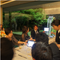 「映像演出にこだわりたい」「お気に入りのレストランを使いたい」という希望がありましたが、後方の席からはスクリーンが見えづらく、タブレット動画システムを結婚式で使わせてもらいました。おかげでゲストの皆さんに映像を楽しんでいただけ、ペーパーアイテムのコスト削減にもつながりました!